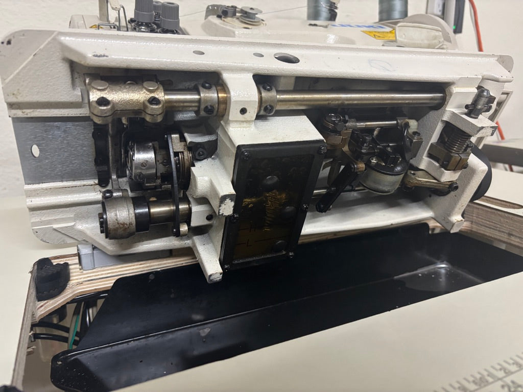 Pre-owned Juki DNU 1541-7 Fully automatic walking foot sewing machine. The machine comes with a brand new table set with wheels to make it easy to move. It works with 120V electrical. This machine needs pressure air.