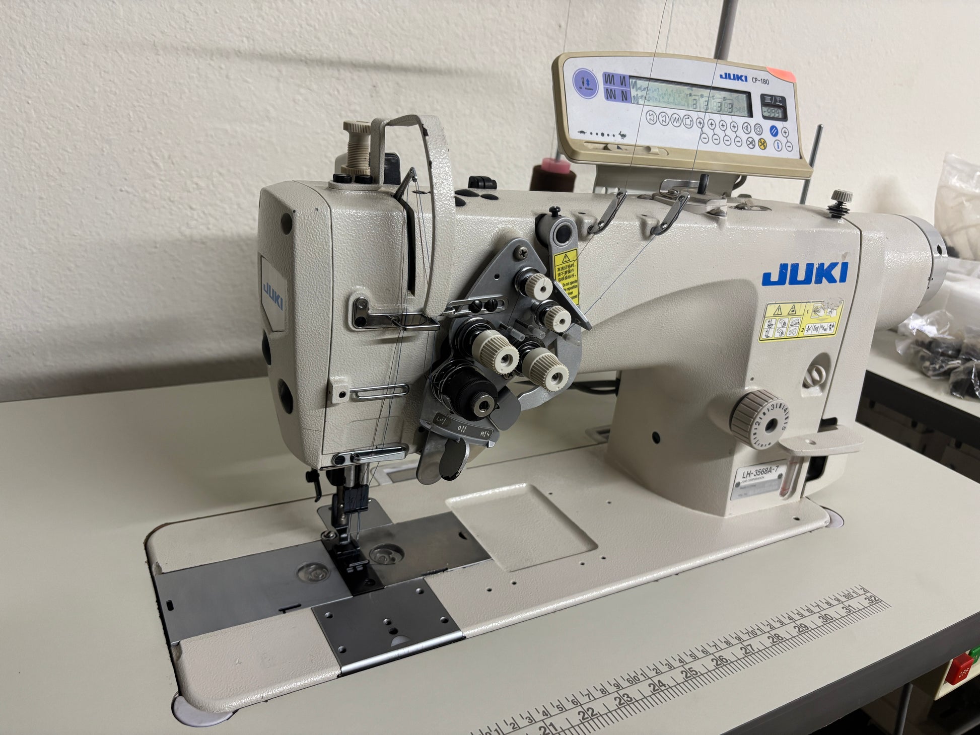 Pre-owned JUKI LH2568A-7/SC920/CP180 fully-automatic double needle split bar sewing machine. Machine head is used, in good condition. Table top and stand are brand new comes with wheels make it easy to move around.