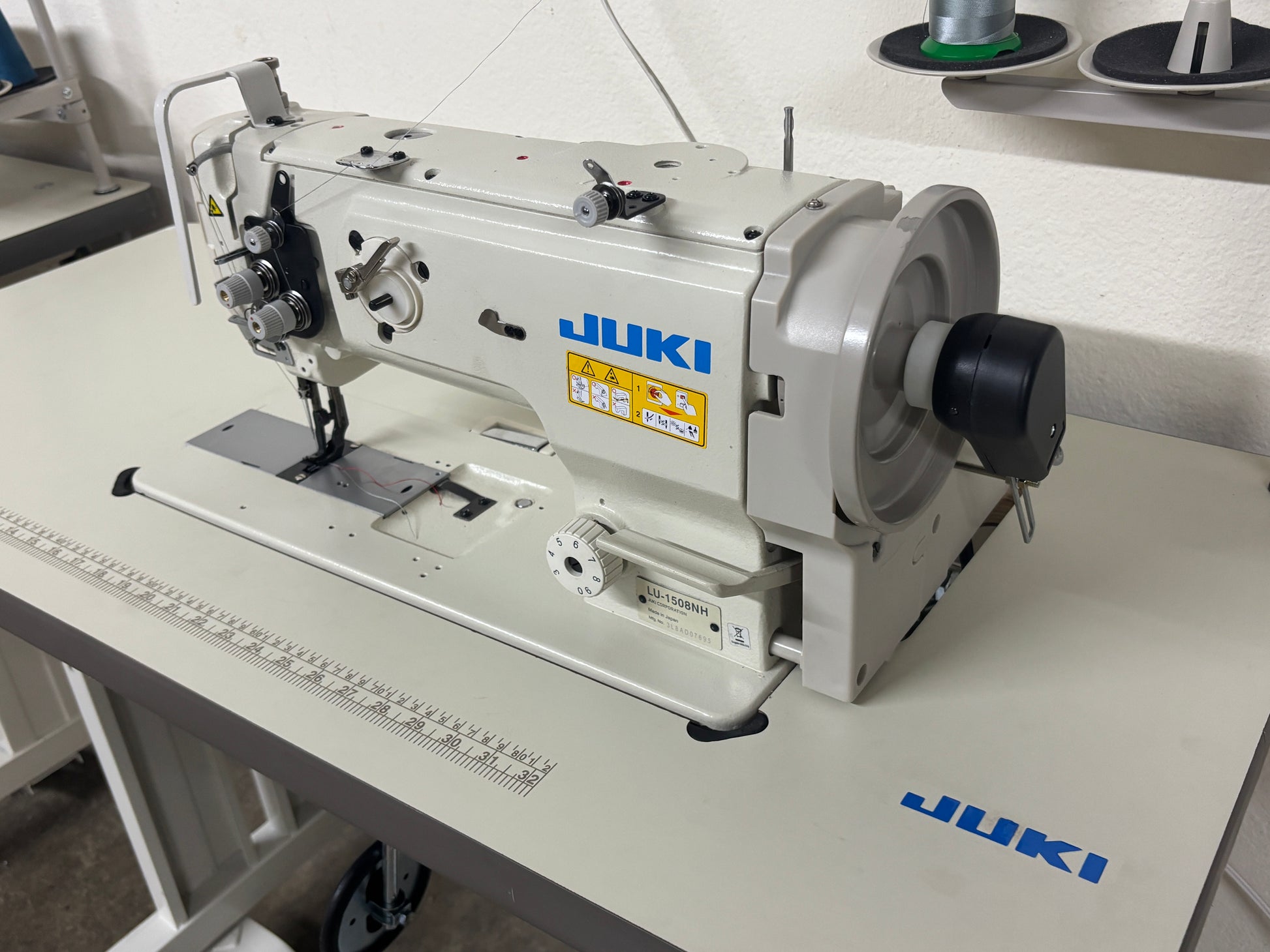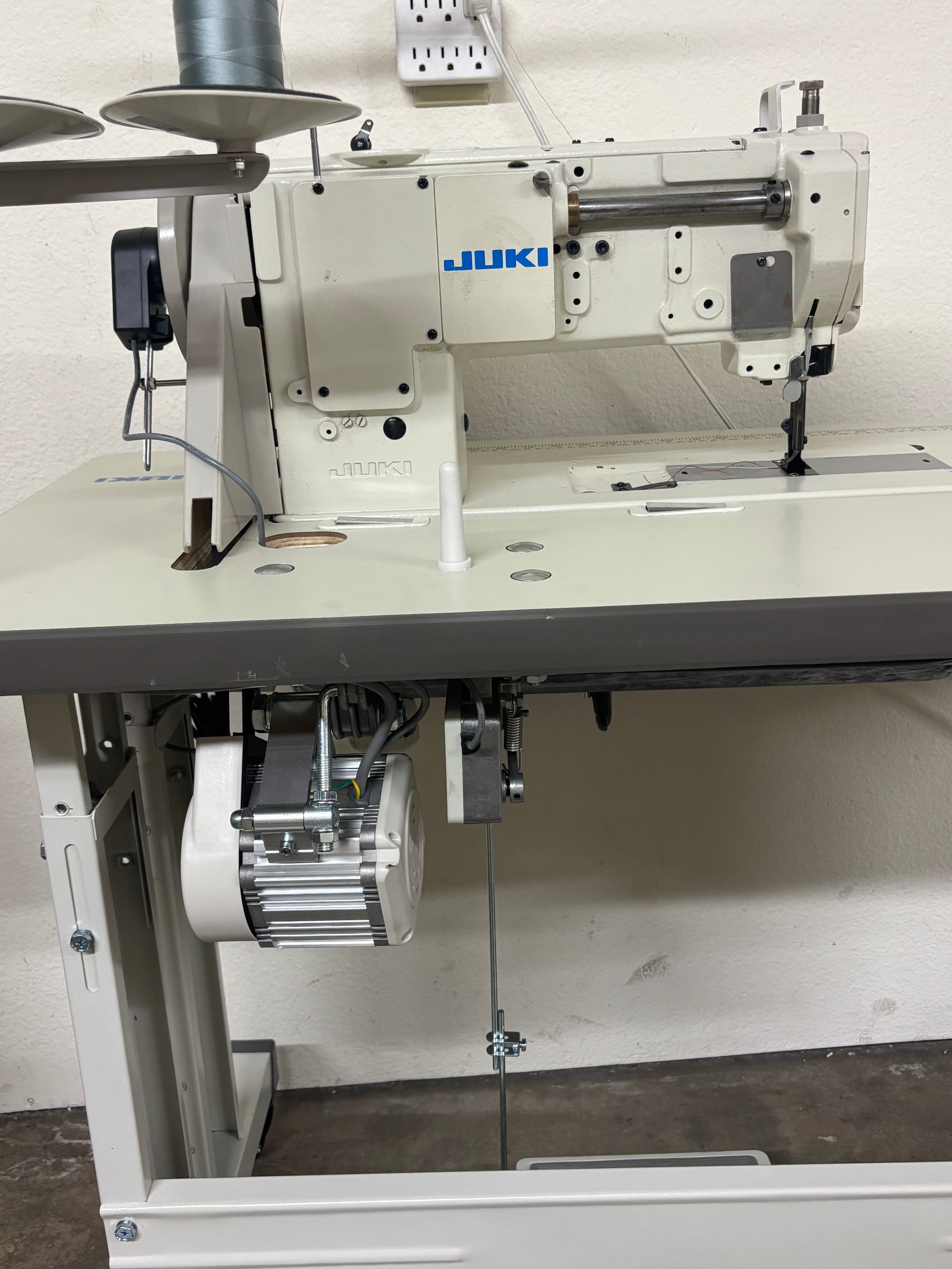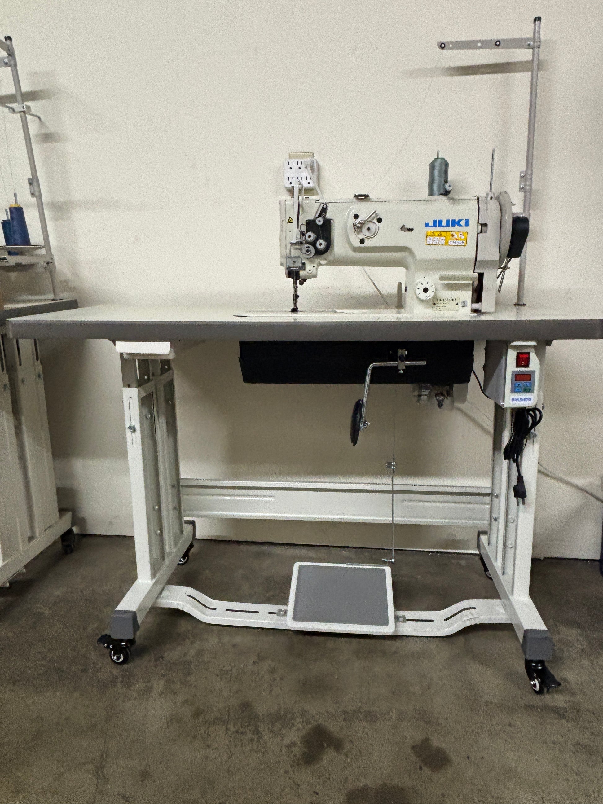 Pre-owned Juki LU-1508NH Unison-feed Extra heavy duty Single Needle Walking Foot Lockstitch Industrial Sewing Machine. The Machine comes with a brand new table set and a brand new 750W servo motor, attached with needle positioner.