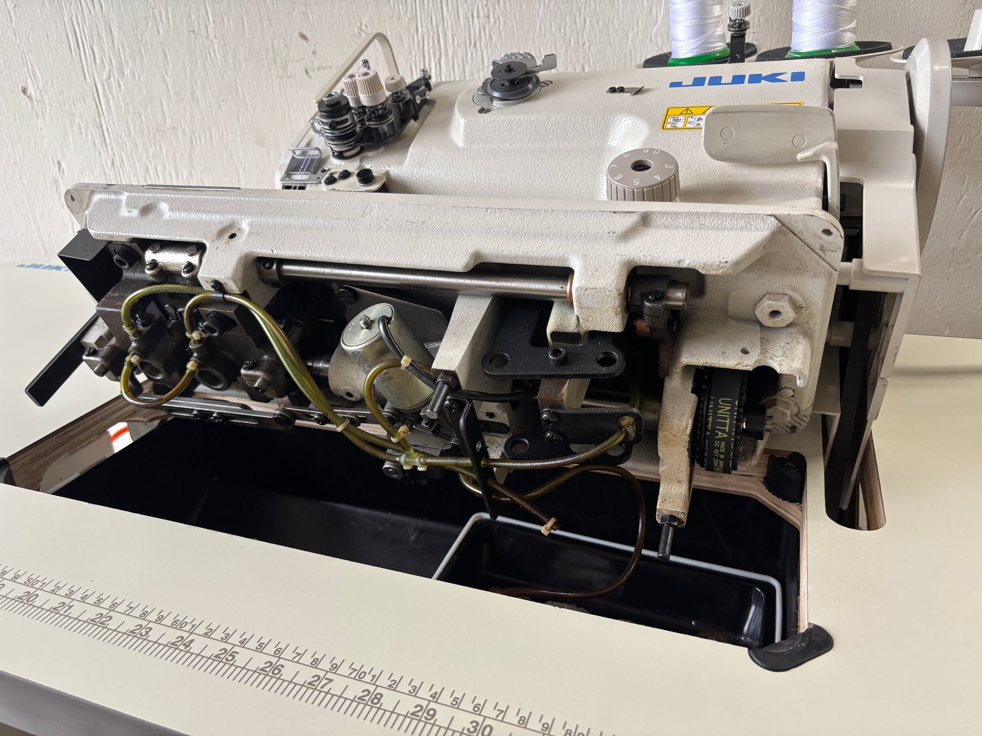 This is original made in Japan fully automatic double needle walking foot sewing machine. The head is good condition used, fully functional. The table top and stand is brand new, comes with wheels make it easy to move around.